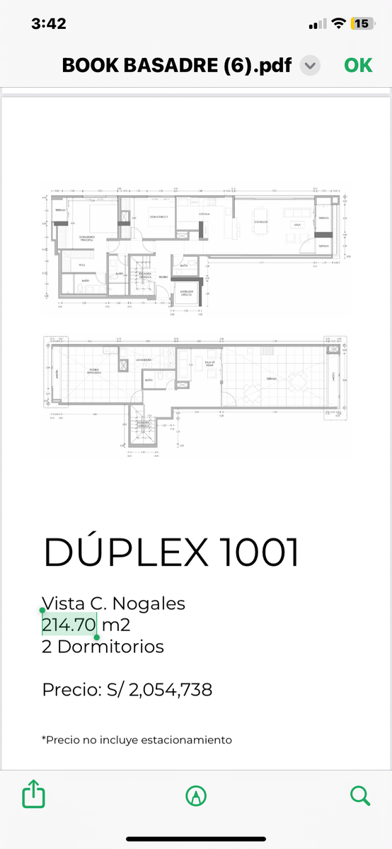 Bello penthouse dúplex en venta de 2 dormitorios y con terraza y estreno en San Isidro. Ingresamos al departamento con ascensor directo a recibidor. La sala comedor muy iluminado con doble vista y balcones, sala de estar, baño de visitas, cocina abierta con lindos muebles de cuarzo y equipado con cocina a gas, campana extractora y horno marca Bosch. El dormitorio principal también en esquina tiene doble vista, balcón, walk in closet y baño incorporado con doble lavado. El segundo dormitorio tiene baño incorporado. Todos los pisos son de madera estructurada. En el segundo nivel tenemos una amplia sala de estar con baño y con acceso a la hermosa terraza, con BBQ, depósito o cuarto de servicio y lavandería. El edificio cuenta con lindo jardín central, sala de usos múltiples, estacionamientos de visita y lindo lobby de recepción con zona para coworking. Precio en Soles S/. 2´013,000 (TC 3,5)